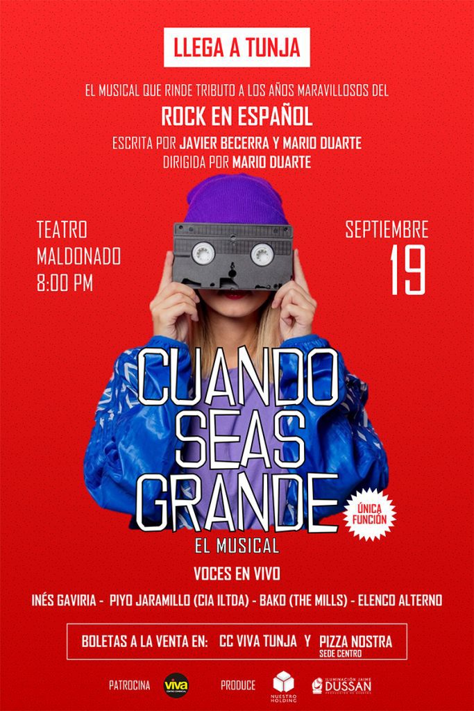 Para conmemorar esta fecha inolvidable llega cuando seas grande, la obra musical dirigida por Mario Duarte y que después de agotar todas las funciones en el Teatro Nacional La Castellana de Bogotá, inicia una gira nacional que tendrá como punto de partida el Teatro Maldonado de la ciudad de Tunja el 19 de septiembre. Una historia musical llevada al teatro de la mano de un elenco conformado por artistas como Inés Gaviria, cantante, compositora y productora musical; Bako, voz y compositor principal de The Mills, y Piyo Jaramillo, cantante, compositor y escritor en Compañía Ilimitada, acompañados por un reconocido grupo de actores y músicos en vivo,