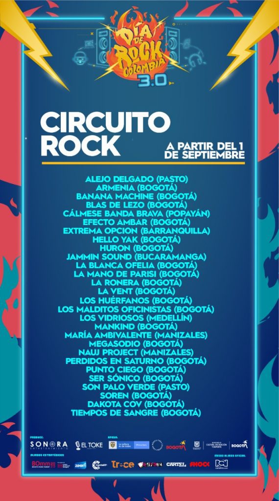 Y como es el mes más rockero del año el Circuito Rock estará sonando con las bandas semifinalistas que desde todas partes de Colombia estarán en este festival y sus plataformas que pueden disfrutarse desde cualquier cuidad o país. Las bandas elegidas son: Alejo Delgado, Armenia, Banana Machine, Blas d Lezo, Cálmese banda brava, Efecto Ámbar, Extrema opción, Hello Yak, Hurón, Jammin Sound, La blanca Ofelia, La mano de Parisi, La ronera, Le vent, Los Huérfanos, Los malditos oficinistas, Los vidriosos, Mankind, Maria Ambivalente, Megasodio,Nauj Project, Perdidos en saturno, Punto ciego, Ser sónico, Son palo verde, Soren, Dakota Cov, Tiempos de Sangre. Bandas que por su calidad, talento, trabajo y proyección acompañarán las charlas, documentales y toda la programación prevista desde el 1 de septiembre.