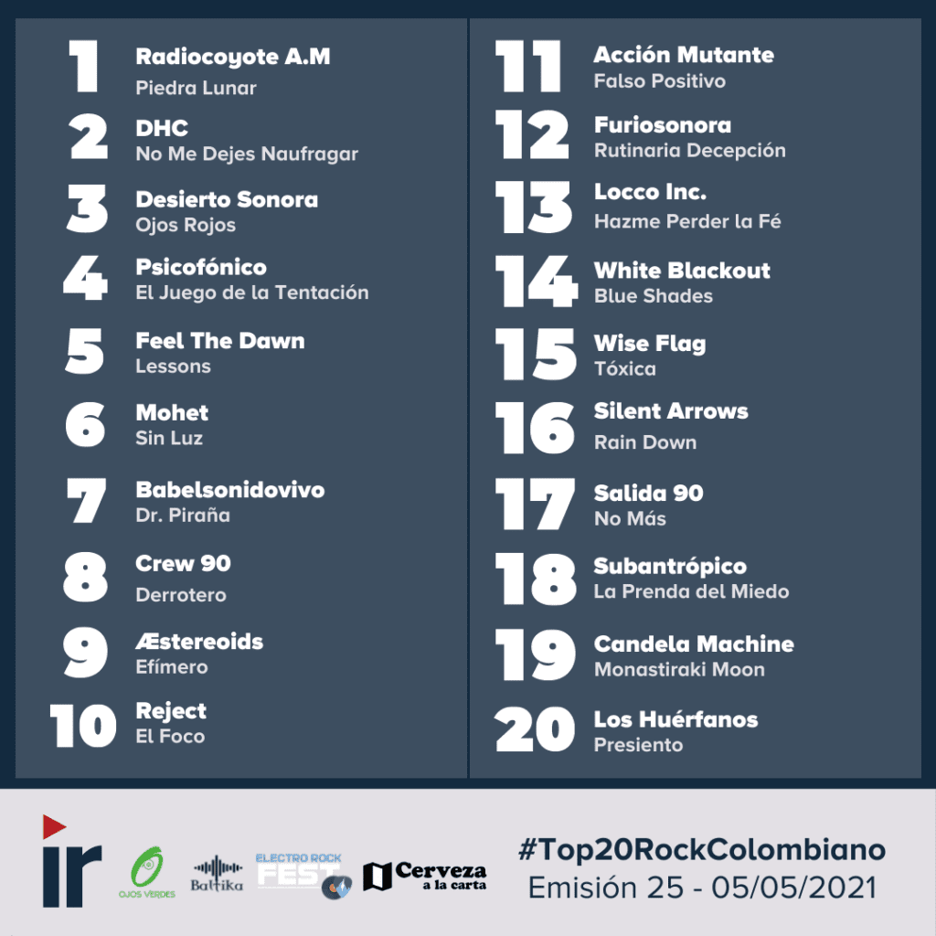 Continúa el conteo más importante del rock colombiano y en mayo, una banda quedó en primer lugar con mucho esfuerzo. Esto fue lo que pasó en los miércoles y sábados del mes de mayo del 2021 en el #Top20RockColombiano.